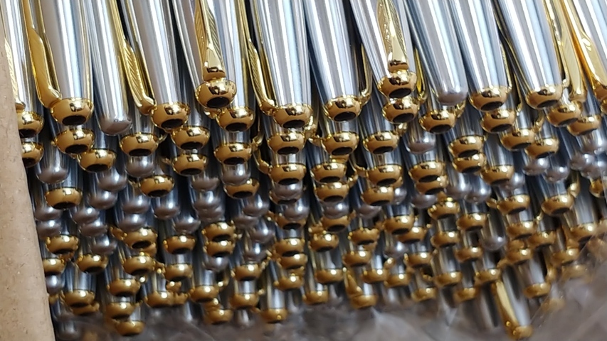 Với bút ký kim loại, chất liệu phổ biến lại thuộc về nhôm, đồng, thép, thép không gỉ.. tuy nhiên, với thép không gỉ thường được giữ nguyên bề mặt mà không sơn phủ hay mạ cũng đảm bảo độ đẹp cũng như không bị ôxy hóa. Như vậy 2 loại chất liệu phổ biến là nhôm và đồng thì đều phải được mạ hoặc sơn phủ bề mặt