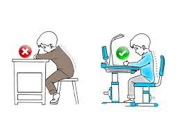 Điều chỉnh độ cao và góc nghiêng bàn hợp lý, sao cho khi trẻ ngồi, 2 bàn chân đặt trên sàn nhà, để thoải mái, rộng bằng vai, song song với nhau, trọng lượng cơ thể dồn vào mông và đùi, không tì vào bàn hay nằm rạp xuống, đầu hơi cúi. Hướng ánh sáng nếu dùng đèn cần hướng từ bên trái sang để tránh khuất bóng tay. Khi viết bên phải, cần dịch chuyển vở về bên trái để đảm bảo trang viết luôn ở thẳng trước mặt.