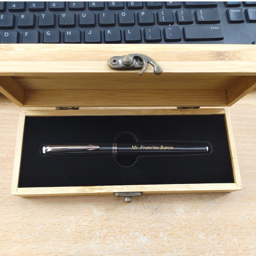 Khách hàng có thể tạo nên câu chuyện riêng trên chiếc bút của mình: một cái tên, lời chúc, hay ngày đặc biệt – tất cả được thể hiện tinh tế trên chất liệu kim loại hoặc gỗ cao cấp.