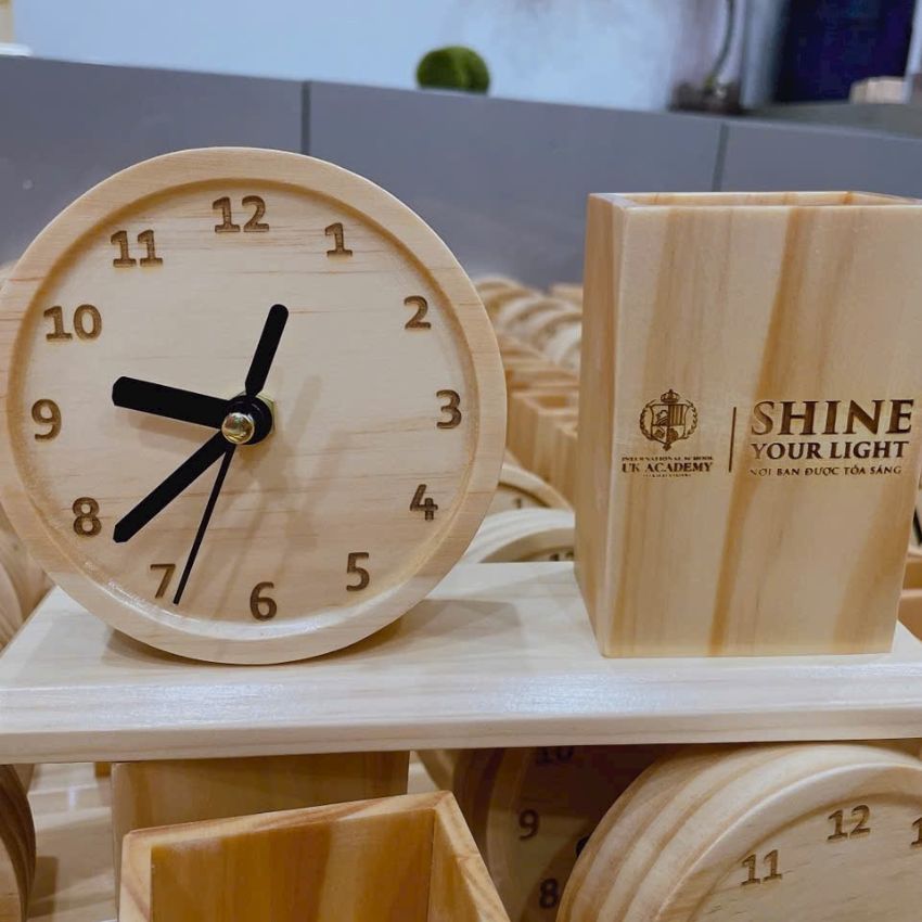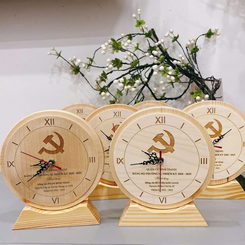Trong vô vàn món quà lưu niệm, đồng hồ gỗ khắc hình luôn nổi bật bởi sự kết hợp hoàn hảo giữa tính thẩm mỹ, giá trị sử dụng và yếu tố cá nhân hóa. Với thiết kế sang trọng, chất liệu thân thiện với môi trường cùng công nghệ khắc laser/in cao cấp, sản phẩm của 3D Hải Phong không chỉ là một chiếc đồng hồ – mà còn là một dấu ấn thời gian, lưu giữ những khoảnh khắc đáng nhớ, những biểu tượng ý nghĩa cho doanh nghiệp và cá nhân.